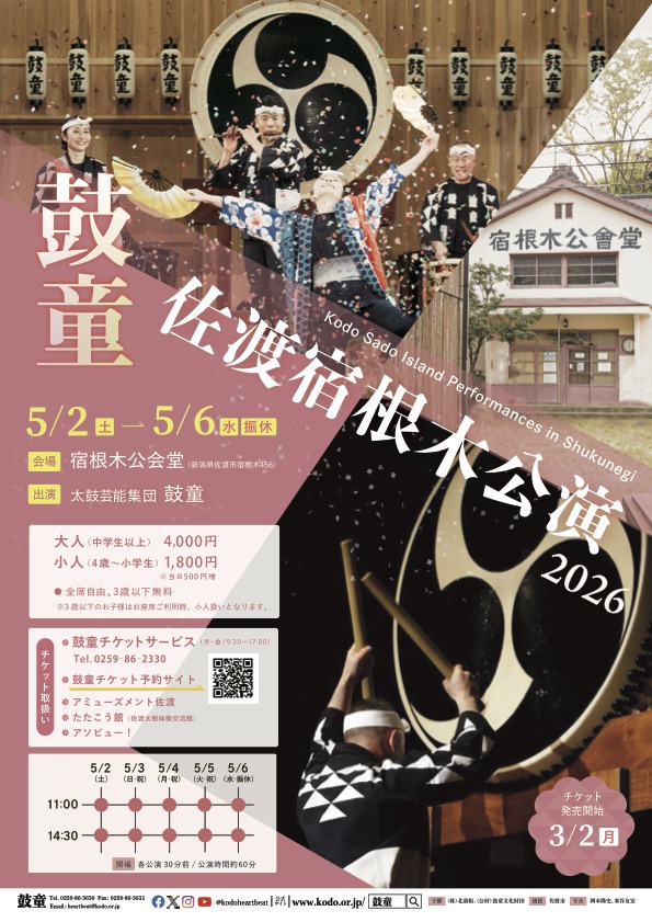b) b) A small group of Kodo’s members will present up-close taiko performances at the local retro playhouse at 11:00am and 2:30pm from 5/2 to 5/6. Ticket ¥4,000 Phone: 0259-86-2330