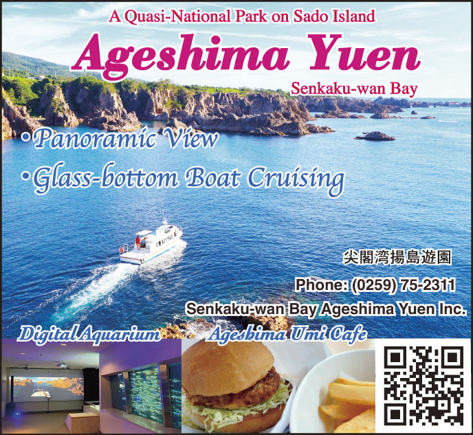 Senkakuwan Bay, a designated Scenic Beauty in Sado-Yahiko-Yoneyama Quasi-National Park, offers breathtaking views of dramatic coastal scenery. Visitors can explore underwater wonders aboard a glass-bottom boat in the marine park zone. The digitally renovated aquarium showcases marine life native to the surrounding waters. Entrance and boarding set fee is ¥1,600, which includes access to the scenic viewpoints, visits to the digital aquarium and cave projection mapping, as well as a 15-minute glass-bottom boat cruise. Visitors can also enjoy feeding seagulls with kappa ebisen from the boat. The Ageshima Umi Café is also available on site, serving a variety of lunch options.